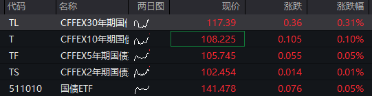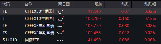 国债期货开盘全线上涨,30年期主力合约涨0.36%,10年期主力合约涨0.12%,5年期主力合约涨0.09%,2年期主力合约涨0.01%。