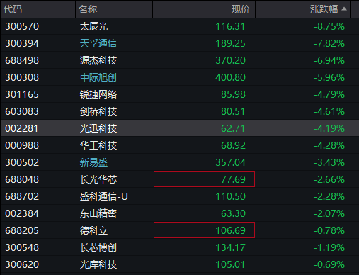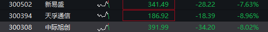 AI硬件方向跌幅进一步扩大,中际旭创、天孚通信、新易盛均跌超10%,华工科技、长光华芯、剑桥科技跌逾6%。