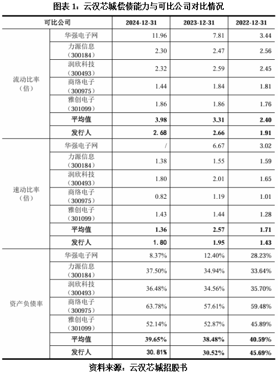 首先,如图表1所示,报告期各期,云汉芯城的资产负债率分别为45.69%、30.52%、30.81%,整体呈下降趋势,且2023—2024年,其资产负债率低于同行可比企业均值,同期流动比率及速动比率也保持在良好区间。