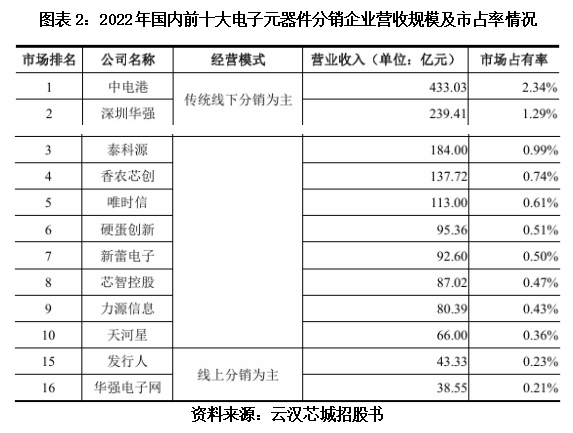 同期,云汉芯城、华强电子网等线上平台分销商的营收在40亿元左右,若以市占率计,云汉芯城市占率仅为0.23%,位列行业第15位。