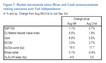 市场对美联储独立性担忧的反应,与所谓的“通胀交易”既有相似之处,也存在差异。自8月初的相关人事变动消息传出以来,各类资产价格走势分化明显。
