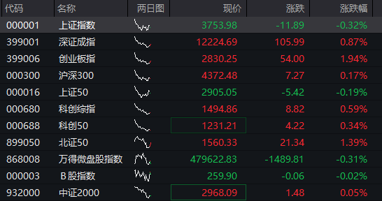 A股:截至发稿,沪指跌0.32%,深成指涨0.87%,创业板指涨1.92%。![]()
