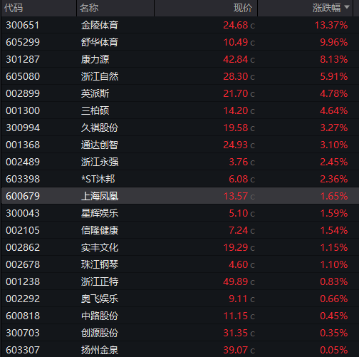 体育概念股开盘领涨,力盛体育、舒华体育竞价涨停,金陵体育、康比特涨超10%,中体产业、共创草坪等多股高开。