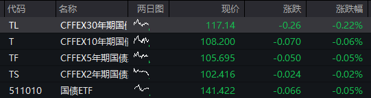 国债期货开盘,30年期主力合约跌0.21%,10年期主力合约跌0.06%,5年期主力合约跌0.06%,2年期主力合约跌0.01%。