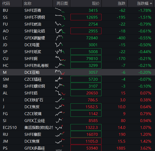 商品:国内商品期货分化,截至发稿,沥青、不锈钢跌超1%,燃油、氧化铝、碳酸锂、鸡蛋、纸浆、铜、热卷板、豆粕、锰硅、螺纹钢等下跌,铁矿石、焦炭、玻璃、工业硅等走高,集运指数、橡胶、焦煤涨超1%,多晶硅涨超3%。![]()