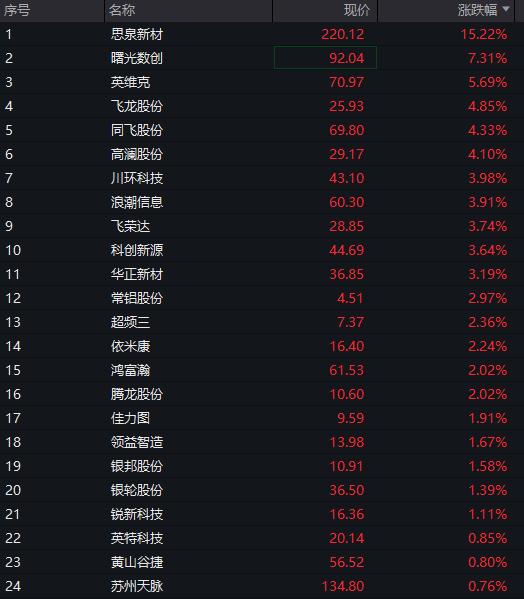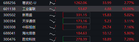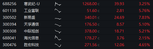 算力硬件股表现活跃,PCB、CPO、液冷服务器等方向领涨,工业富联、依顿电子触及涨停,思泉新材涨超15%,中际旭创、剑桥科技、新易盛、广合科技、景旺电子、申菱环境等多股涨超5%。