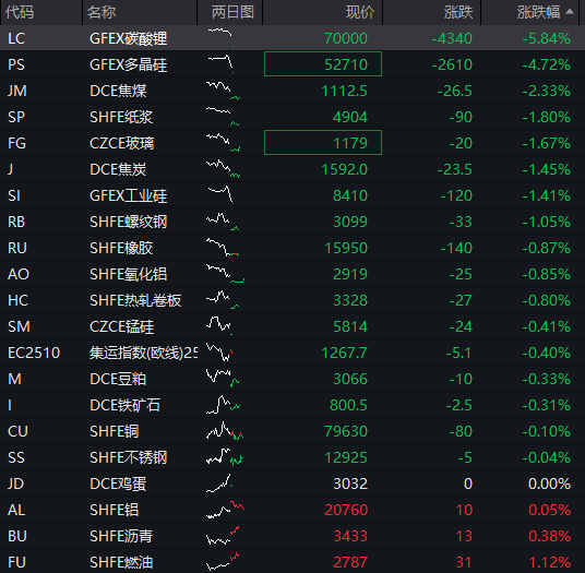 商品:国内商品期货多数下跌,截至发稿,碳酸锂跌超5%,多晶硅跌超4%,焦煤跌超2%,纸浆、工业硅、焦炭跌超1%,橡胶、螺纹钢、玻璃、氧化铝、热卷板、豆粕、集运指数、锰硅、铁矿石、鸡蛋、铜等纷纷下跌,仅有沥青、不锈钢、铝等少数品种上涨。![]()
