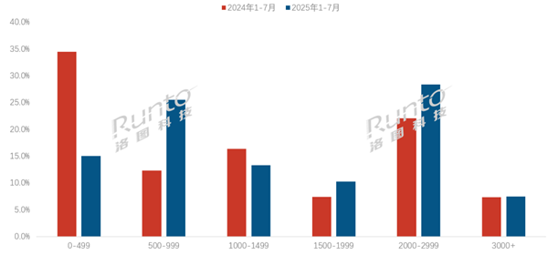 根据洛图科技(RUNTO)传统电商数据显示,在去年2024年同期,0-499元价格段还占据着最大的销量份额,但到2025年,其份额就大降了19.5个百分点至15.0%,落到第三大的位置。