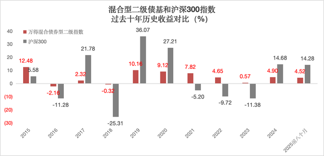据Wind数据,从2015年1月1日至2025年8月31日,混合债券型二级基金指数累计上涨52.28%,而同期沪深300指数涨幅为27.25%。2024年以及2025年前八个月,混合债券型二级基金指数分别上涨4.90%、4.52%;2024年以来累计涨幅达9.65%。