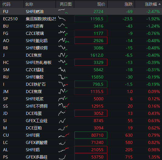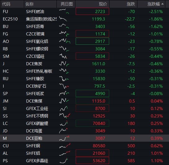 商品:国内商品期货涨跌不一,截至发稿,燃油跌超2.5%,集运指数、沥青、玻璃跌超1%,氧化铝、螺纹钢、锰硅、焦炭、热卷板、橡胶、铁矿石、纸浆等走低;工业硅、不锈钢、碳酸锂、鸡蛋、豆粕、铜等上涨,铝、多晶硅涨超1%。![]()