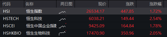 港股:截至发稿,恒指涨1.72%,恒科指涨2.54%。![]()