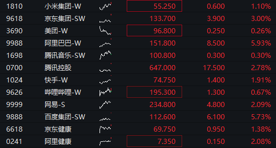 大型科网股全线上涨,阿里巴巴一度涨超6%,续创近四年新高。百度集团涨超5%。京东、腾讯控股、网易等涨幅居前。