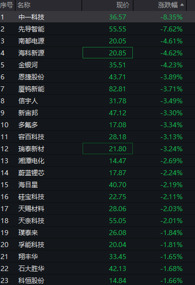 固态电池概念股展开调整,先导智能跌超7%,纳科诺尔、天际股份、宏工科技、华盛锂电、杭可科技跌超5%,利元亨、金银河、恩捷股份等跟跌。