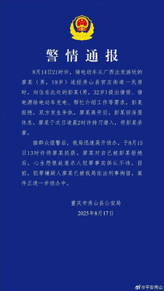 8月17日,重庆市秀山县公安局发布警情通报称,8月14日晚上9时左右,骑电动车从广西出发游玩的19岁男子廖某,途经秀山县官庄街道一处民房时,向住在那里的32岁男子彭某提出借宿、借电源给电动车充电、帮忙介绍工作等需求,遭彭某拒绝后双方发生争执。后来廖某离开,彭某回房休息。