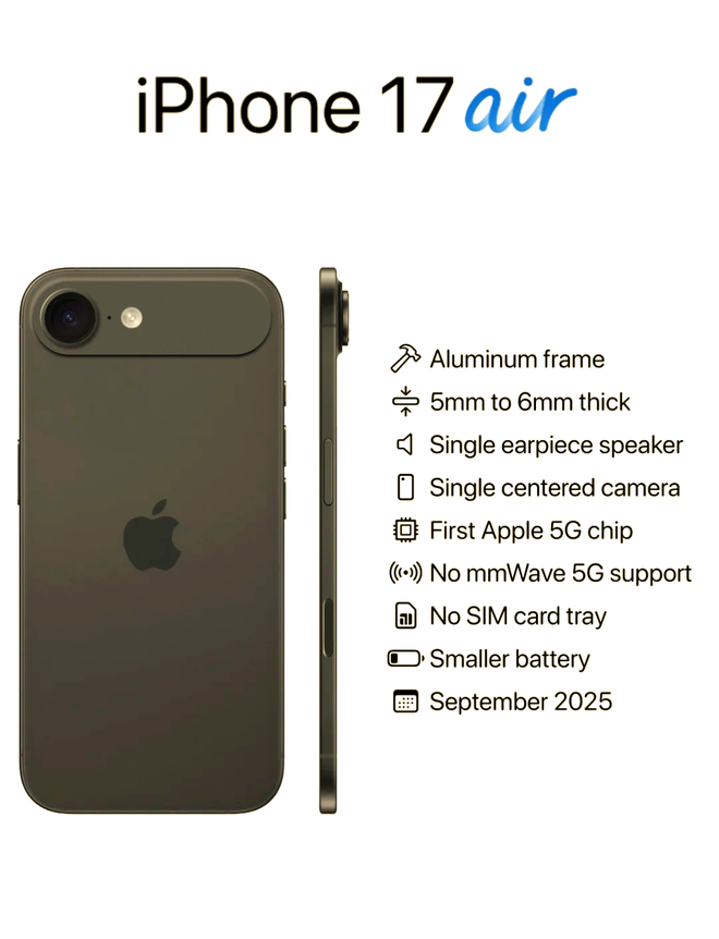 本届最亮眼的角色,当属iPhone Air——新款手机不带数字,理论上不属于iPhone 17系列,而是特别版。它的最大特点是薄,厚度仅5.5毫米,是iPhone史上最纤薄的手机。