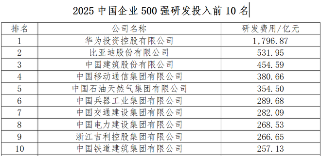 具体企业研发费用方面,华为以1796.87亿元位列第一。比亚迪、中国建筑、中国移动、中国石油分别以531.95亿元、454.59亿元、380.66亿元、354.50亿元的研发投入,列榜单第2到5位。
