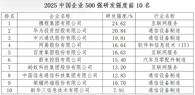 具体到企业来看,携程以24.62%的研发强度位列第一,华为、中兴通讯、网易、百度分别以20.84%、19.81%、16.64%、16.63%的研发强度分列第二到第五。研发强度前十名中,有五家企业来自通信设备制造业。