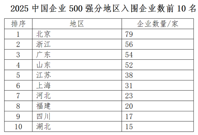 2025中国企业500强共分布在30个省(自治区、直辖市)中,分布最多的五个地区依次是北京、浙江、广东、山东和江苏。