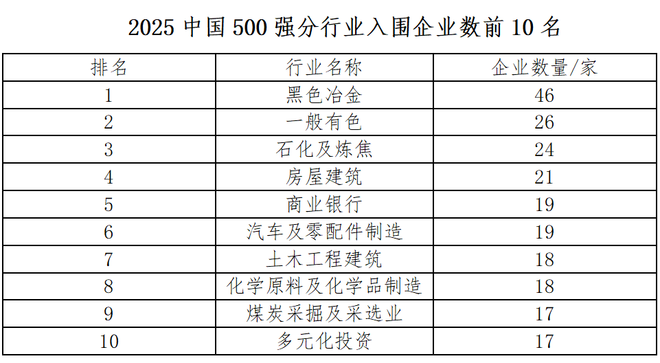 2025中国500强分行业入围企业数前10名分别为黑色冶金46家、一般有色26家、石化及炼焦24家、房屋建筑21家、商业银行19家、汽车及零配件制造19家、土木工程建筑18家、化学原料及化学品制造18家、煤炭采掘及采选业17家、多元化投资17家。