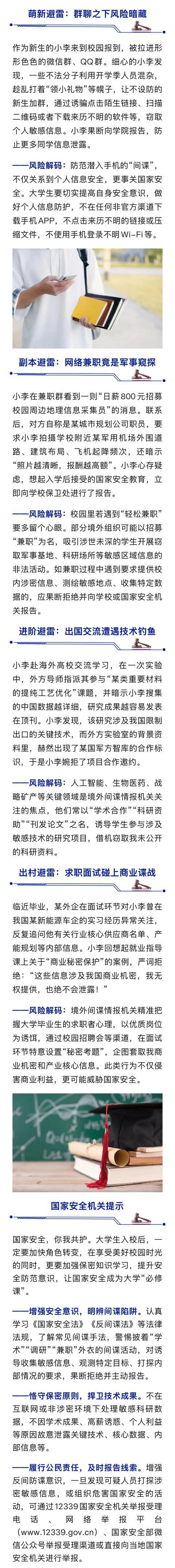 国家安全部微信公众号9月16日消息,金秋九月,校园里洋溢起青春的气息。当开启大学这段新旅程,从大一报到的一次群聊邀请,到大四投递的一份简历,国家安全的考题早已渗透在大学生成长的每个阶段。让我们一道排雷避坑,一路通关吧。