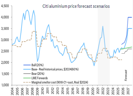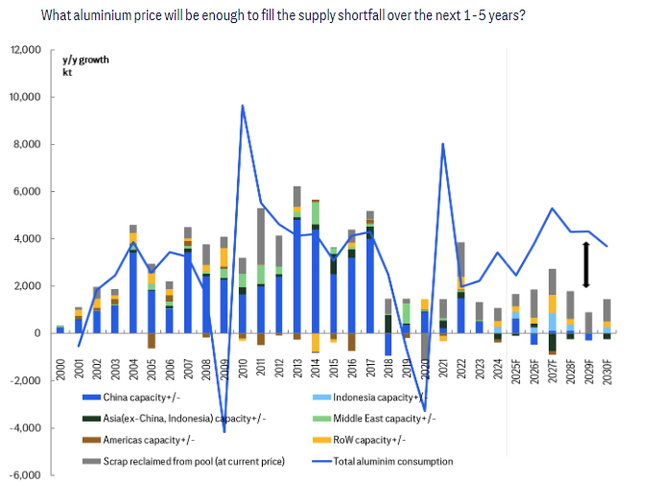 如果这依然无法弥补供需缺口,或废铝供应未能超预期增长,市场将不得不通过更高的价格来抑制需求。在这种情况下,铝价可能需要在4000美元/吨附近运行,这与2000年代初平衡市场所需的价格水平类似。