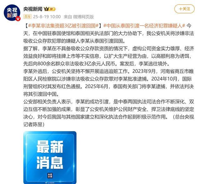 中国从泰国引渡一名经济犯罪嫌疑人,公安部披露:李某向800余名群众非法集资超3亿元,逃往境外在泰国被逮捕
