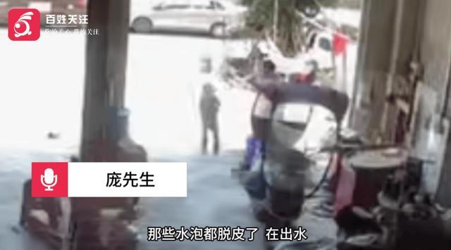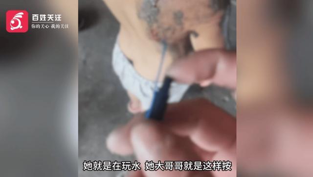 庞先生:不要小瞧这个,她就是在玩水,她大哥哥就是这样按。你看!皮肤都烂了,这个东西千万不要给小孩玩。